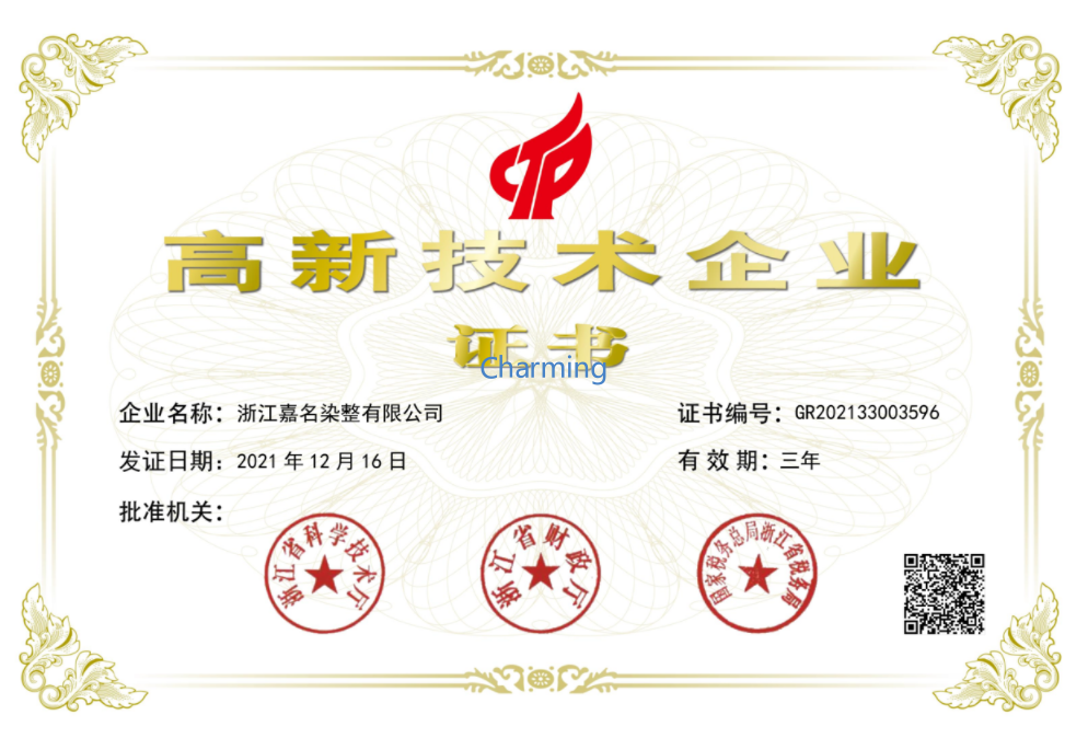企業已通過ISO9001質量體系認證、ISO14001環境體系認證、Oeko-Tex Standard 100國際生態紡織品認證、OCS有機產品認證、GRS全球回收標準認證。嘉名人將以新發展理念為引領,著力開發“綠色、科技、時尚、智慧”的新產品,不斷增強企業的核心競爭力,朝著“致力成為國內外知名服裝品牌的首選面料供應商”的企業愿景邁進。