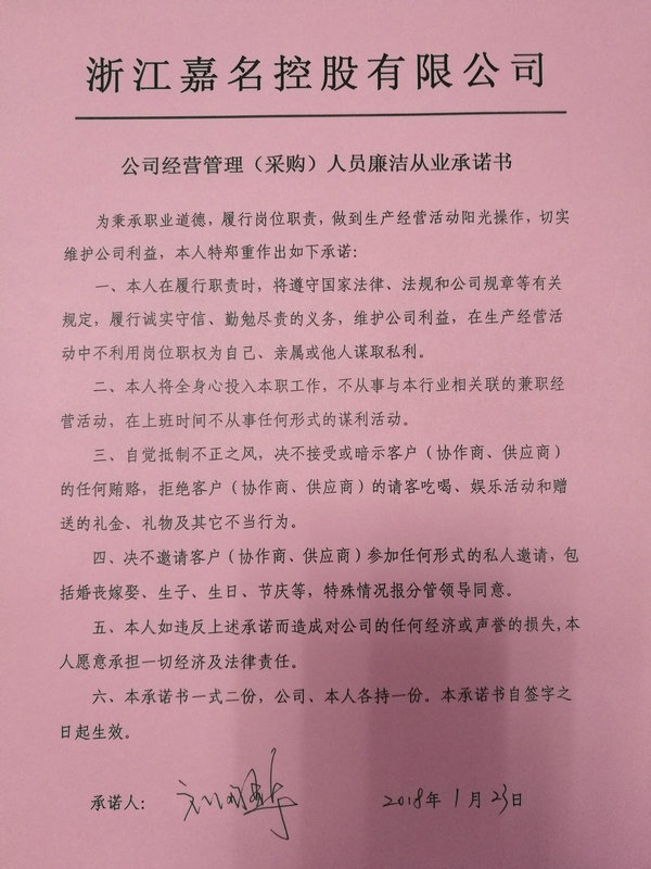 會議指出,對公司廉潔風險重點崗位的經營管理(采購)人員簽訂廉潔從業承諾書,是加強公司經營管理,推進依法治企的需要;是加強公司干部隊伍建設,從政治上關愛干部的需要;是加強企業黨建工作,實施從嚴治黨的需要。